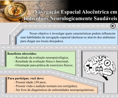 O objetivo geral é investigar se condições biossociodemográficas (exemplo: estado de saúde, sexo biológico ou idade cronológica) e neuropsicológicas (exemplo: prestar atenção, resolver problemas, aprender ou memorizar informações) podem influenciar as habilidades de navegação espacial (deslocar-se em ambientes para chegar aos locais desejados).