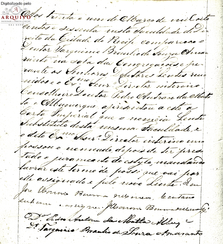 Após transcorrido onze anos, e no exato dia 14 de Fevereiro de 1871, perante o Diretor Barão de Camaragibe, compareceu Dr. Tarquínio Bráulio de Souza Amaranto para tomar posse do lugar de Lente Catedrático da 1ª cadeira do 3º ano (Direito Civil Pátrio), vaga por ter sido transferido o respectivo Catedrático Dr. Aprígio Justiniano da Silva Guimarães para 2º cadeira do 5º ano, do qual foi Proprietário o Conselheiro Pedro Autran da Matta Albuquerque que foi jubilado na conformidade do decreto legislativo Nº 1769 de 13 de julho de 1870. Transferência que teve lugar por decreto imperial de 04 do corrente ano.