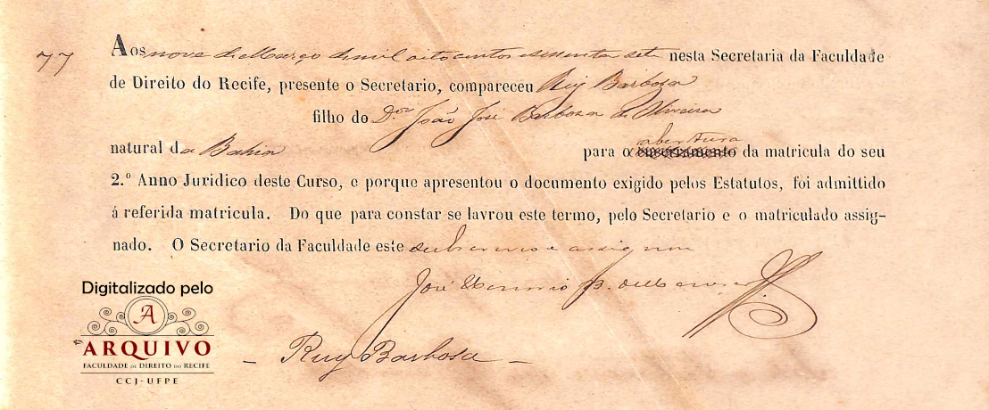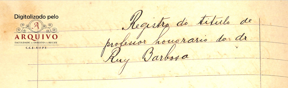 E conforme menciona no Livro de Registo de Título, datado no dia 13 de agosto de 1918, onde encontra escrito que a Congregação da Faculdade de Direito do Recife, Estado de Pernambuco, tendo resolvido em sessão de 08 de agosto de 1918, eleger o Dr. Ruy Barbosa seu Professor Honorário, de acordo com os arts. 53 do decreto 11520 de 18 de março de 1915 e 21 ao respectivo Regimento Interno e reconhecimento assim as excepcionais predicados que enobrecem tão preclaro brasileiro, entre os quais se destacou sua presente mentalidade e uma extraordinária cultura literária e jurídica que o consagrou uma verdadeira glória nacional, mandou passar-lhe o presente diploma.