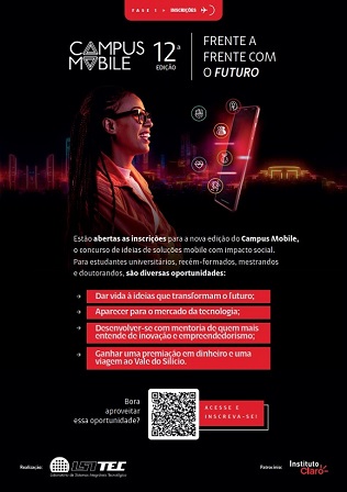 Estão abertas até o dia 12 de novembro as inscrições para a 12ª edição do Campus Mobile, concurso de ideias de aplicativos destinado a estudantes universitários (de graduação, mestrado ou doutorado) e recém-formados. As pessoas ou equipes vencedoras de cada categoria recebem premiação em dinheiro e uma viagem para o polo tecnológico Vale do Silício (EUA).