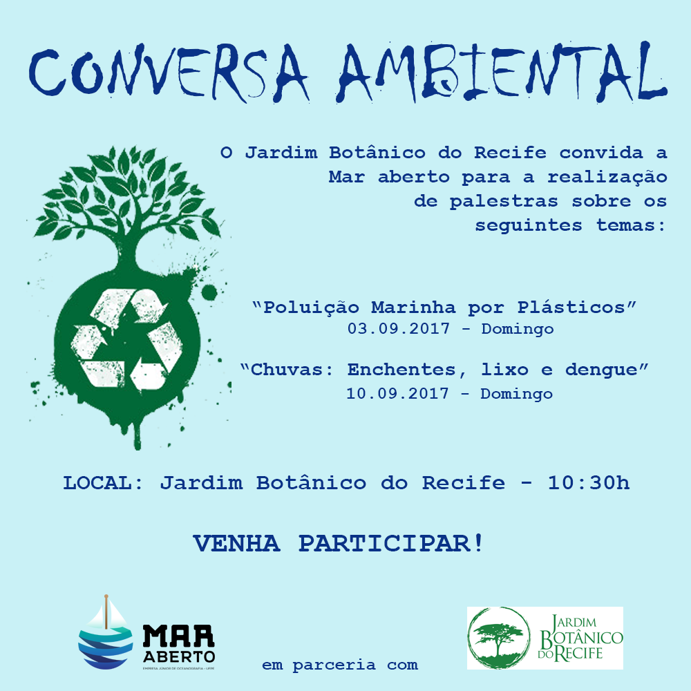 A Mar Aberto, empresa júnior de Oceanografia da Universidade Federal de Pernambuco (UFPE), foi convidada para participar do projeto Conversa Ambiental, realizado pelo Jardim Botânico do Recife. A primeira palestra, sobre “Poluição marinha por plásticos”, será neste domingo (3). A segunda, sobre “Chuvas: enchentes, lixo e dengue”, será no domingo seguinte (10). Ambas serão realizadas às 10h30, no auditório do Jardim Botânico (BR 232, km 7,5, Curado).