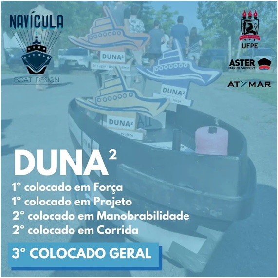A equipe Navícula Boat Design, projeto de extensão do curso de Engenharia Naval da Universidade Federal de Pernambuco, conquistou o 1º lugar na Prova de Força, 1º lugar na Prova de Projetos, 2º lugar na Prova de Manobrabilidade, 2º lugar na Prova de Corrida e 3º lugar na Colocação Geral do Desafio Universitário de NautiDesign Duna2. Este evento, realizado de 24 a 27 de novembro na cidade de Joinville (SC), foi organizado pela Universidade Federal de Santa Catarina (UFSC).