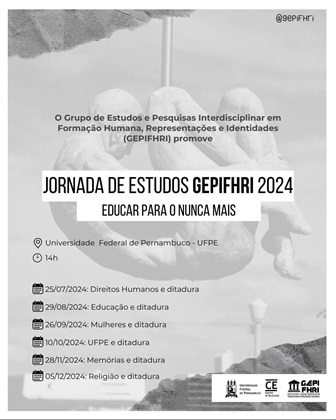 O Grupo de Estudos e Pesquisas Interdisciplinar em Formação Humana, Representações e Identidades (Gepifhri) da UFPE inicia, amanhã (25), às 14h, a “Jornada de Estudos Gepifhri”, iniciativa que consiste na socialização, discussão e debate de textos previamente elencados pelos membros do grupo. Com o tema “Educar Para o Nunca Mais“, a Jornada de Estudos Gepifhri 2024 voltará seu olhar para as memórias e as resistências relativas ao período da ditadura civil-militar no Brasil (1964-1985). Para participar, é preciso fazer inscrição on-line, cujo link está disponível aqui.