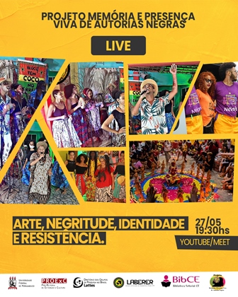O Laboratório de Educação das Relações Étnico Raciais (Laberer) e a Biblioteca Setorial do Centro de Educação, através do projeto de Extensão Memória e Presença Viva de Autorias Negras, convida para a live “Arte, Negritude, Identidade e Resistência”. O evento acontecerá na próxima quinta-feira (27), a partir das 19h30, com transmissão simultânea pelo YouTube e Google Meet. É recomendado que os interessados realizem inscrição prévia no link.