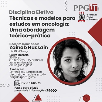 A disciplina eletiva “Técnicas e modelos para estudos em oncologia: Uma abordagem teórico-prática” está com matrículas abertas. Os alunos do Programa de Pós-Graduação em Inovação Terapêutica (PPGIT) já podem se matricular pelo Sigaa, enquanto os demais alunos de pós-graduação devem realizar as matrículas pelo e-mail ppgit.cb@ufpe.br. As aulas serão ministradas em língua inglesa pela docente Zainab Hussain (Inserm/França).