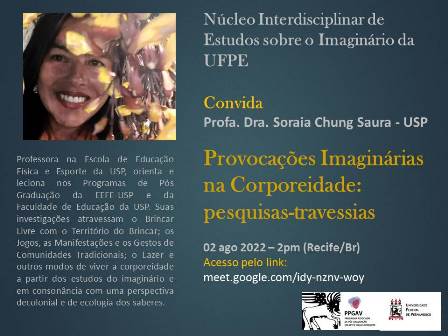 O grupo de pesquisas do Núcleo Interdisciplinar de Estudos sobre o Imaginário (Niei) retorna às atividades com a palestra “Provocações Imaginárias na Corporeidade: pesquisas-travessias”, da professora Soraia Chung Saura, da USP. A palestra acontece na terça-feira (2), às 14h, via Google Meet.