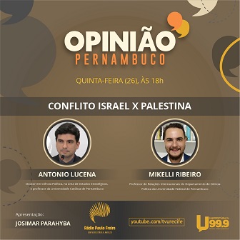 O “Conflito Israel x Palestina” é o tema do Opinião Pernambuco desta quinta-feira (26). Para abordar o assunto, o programa conta com as participações de Antonio Lucena, doutor em Ciência Política, na área de estudos estratégicos, e professor da Universidade Católica de Pernambuco, e Mikelli Ribeiro, professor de Relações Internacionais do Departamento de Ciência Política da Universidade Federal de Pernambuco. Apresentado por Josimar Parahyba, o Opinião vai ao ar a partir das 18h, na Rádio Universitária FM 99,9.