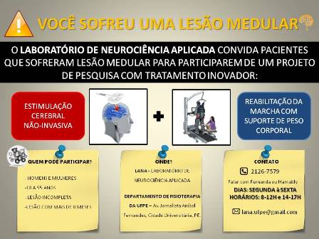 Para participar da pesquisa, é necessário cumprir os seguintes requisitos: homens e mulheres; de 18 a 55 anos; lesão incompleta; e lesão com mais de oito meses. Os interessados devem contatar o Laboratório de Neurociência Aplicada (Lana), que fica no Departamento de Fisioterapia da UFPE, no Campus Recife, para marcar a triagem. A marcação pode ser feita pelo e-mail ou pelo telefone (81) 2126.7579 – atendimento de segunda a sexta-feira, das 8h às 12h e das 14h às 17h (falar com Fernanda Nogueira ou Hamably Lima).