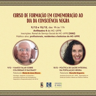 O Serviço Social do Hospital das Clínicas da UFPE, unidade vinculada à Empresa Brasileira de Serviços Hospitalares (Ebserh), dá continuidade à programação alusiva ao Dia Nacional da Consciência Negra. Nos próximos dias 9 e 15, haverá o curso de formação em que será discutido, no primeiro encontro, o colorismo e o racismo e, no segundo encontro, a Política Nacional de Saúde Integral da População Negra. As atividades serão das 9h às 11h, no Anfiteatro 4 do HC. O curso de formação é voltado para os profissionais (de todas as categorias), residentes e bolsistas do hospital universitário, e os interessados devem entrar em contato com o Serviço Social, sala localizada no térreo do HC, ou pelo telefone 2126.3582 para realizar a inscrição, que é gratuita. Será emitido certificado de participação pelo Núcleo de Educação Permanente (Nepe).