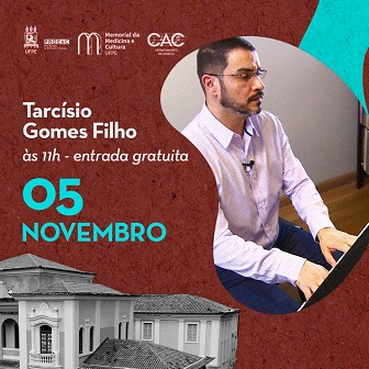 A Série Música no Memorial da Medicina e Cultura apresenta no próximo domingo (5) o pianista e professor Tarcísio Gomes Filho. O projeto é uma parceria da Diretoria de Cultura da Pró-Reitoria de Extensão e Cultura (Proexc) da UFPE com o Departamento de Música do Centro de Artes e Comunicação (CAC), coordenado pelo professor Antônio Carlos Nigro. O concerto será às 11h, na Sala Bandeira & Aguiar, no Memorial da Medicina e Cultura (Rua Amauri de Medeiros, 206 - Derby), que conta com 90 lugares. A entrada é gratuita e os ingressos começam a ser distribuídos 30 minutos antes do espetáculo.