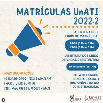 Hoje (28), das 14h às 17h, e amanhã (29), neste mesmo horário, podem ser realizadas inscrições para os cursos da Universidade Aberta à Terceira Idade (Unati) da UFPE, para o segundo semestre deste ano, ou até o preenchimento das vagas. A relação nominal dos cursos e as informações estão disponíveis no site da Unati. Entre os cursos oferecidos estão espanhol, francês, crochê, bordado, pintura, macramê, dança do ventre, automassagem, teatro, filosofia do bem viver e oficina da memória.