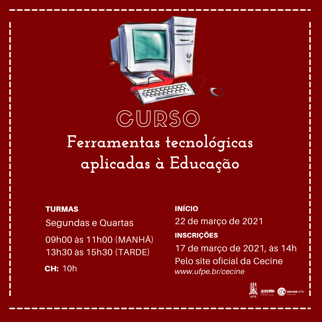 As aulas têm início no próximo dia 22 de março, em duas turmas diferentes: uma pela manhã (09h00 às 11h00) e outra à tarde (13h30 às 15h30), com aulas via Google Meet. Cada turma com 50 vagas, que serão preenchidas no dia 17 de março, a partir das 14h00, em um formulário disponível em nosso site (www.ufpe.br/cecine). Fique ligad@!