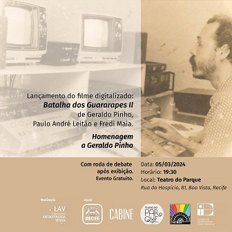 O programador de cinema Geraldo Pinho recebe homenagem com a exibição da versão digital do seu filme “A Batalha dos Guararapes Parte II”. A sessão especial será realizada, no dia 5 de março, às 19h30, no Teatro do Parque, área central do Recife, com portões abertos ao público (os ingressos serão disponibilizados gratuitamente na bilheteria do teatro uma hora antes da projeção). A iniciativa integra o projeto “O Programador”, desenvolvido pela equipe do Laboratório de Antropologia Visual (LAV) da UFPE, com apoio do Governo do Estado de Pernambuco, via Funcultura, sistema de lei de incentivo à cultura estadual mantido pela Secretaria de Cultura de Pernambuco e a Fundarpe.
